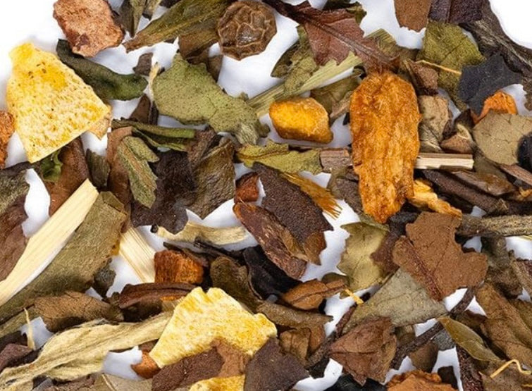 Ingredients: White Tea, Ginger, Cinnamon, Cardamom, Lemon Grass, Coconut, Cloves, Natural Spicy Cinnamon Flavor, Black Peppercorn, Natural Ginger Flavor & Pineapple Pieces. Low Caffeine